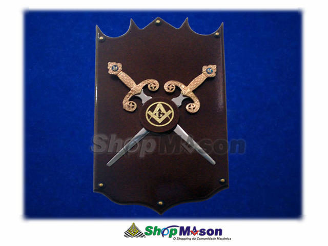 Medalha em metal dourado e 2 espadas cruzadas (comprimento de 30 cm) feitas em lâmina de Aço Inox temperado (2,2 mm).